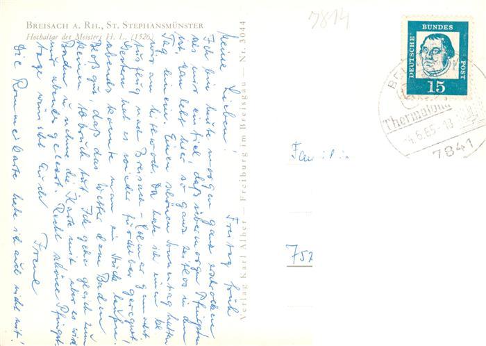 73930027 alte Postkarte Breisach Rhein St. Stephansmuenster Hochaltar postalisch gelaufen Erhaltung siehe scans [FriedD77] KatCode: 11110008315015