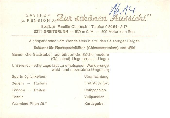 73891421 Breitbrunn Chiemsee Gasthof Pension Zur schoenen Aussicht Alpenpanorama Schloss Kirche Seepartien postalisch nicht gelaufen Werbekarte (keine Postkarte) Erhaltung siehe scans [WerneD78] KatCode: 11110009187121