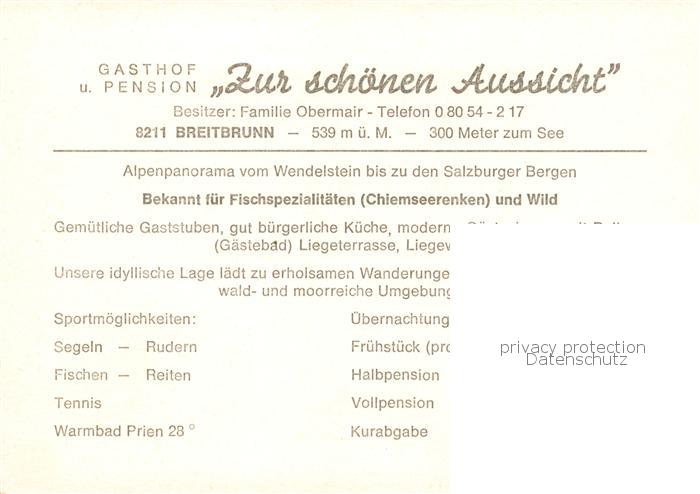 73859362 Breitbrunn Chiemsee Gasthof Pension Zur schoenen Aussicht Segeln Chiemgauer Alpen postalisch nicht gelaufen Werbekarte (keine Postkarte) Erhaltung siehe scans [FriedD77] KatCode: 11110009187121