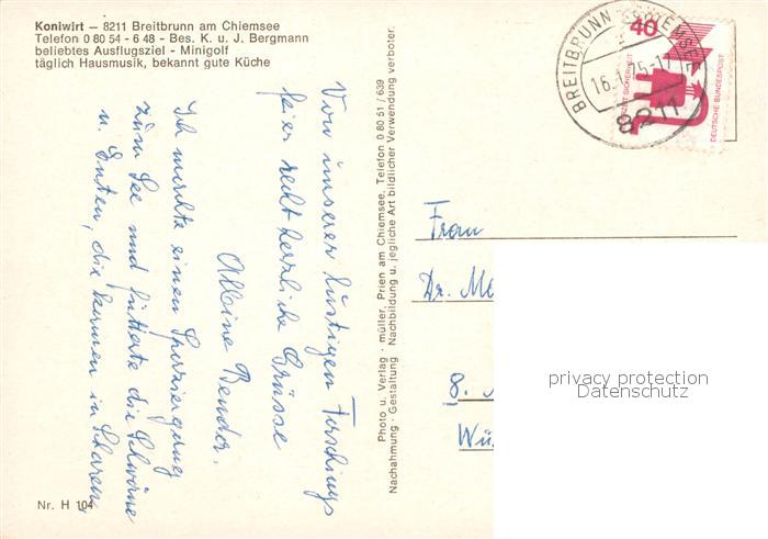 73865077 alte Postkarte Breitbrunn Chiemsee Koniwirt Ausflugsziel Gaststaette Motiv mit Kirche Panorama Blick ueber den See zum Hochgern Chiemgauer Alpen postalisch gelaufen Erhaltung siehe scans [FriedD77] KatCode: 11110009187121