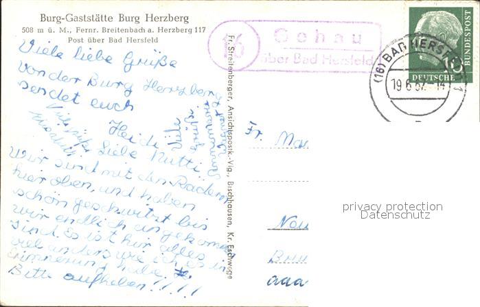 72120863 alte Postkarte Breitenbach Herzberg Burg Herzberg Burggaststaette postalisch gelaufen Erhaltung siehe scans KatCode: 11110006632004