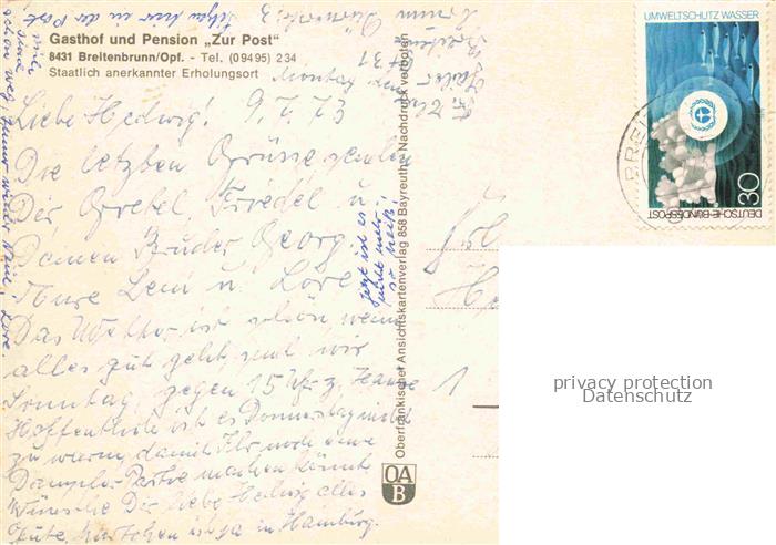 74039808 alte Postkarte Breitenbrunn Oberpfalz Neumarkt Gasthof Pension zur Post Gastraum Ortsansicht mit Kirche postalisch gelaufen Erhaltung siehe scans [FriedD77] KatCode: 11110009373115