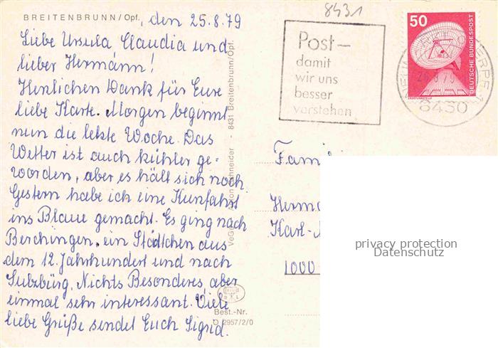 74049315 alte Postkarte Breitenbrunn Oberpfalz Neumarkt Ortsansicht mit Kirche Freibad postalisch gelaufen Erhaltung siehe scans [FriedD77] KatCode: 11110009373115