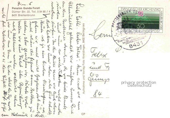 74039755 alte Postkarte Breitenbrunn Oberpfalz Neumarkt Pension Gunda Ferstl postalisch gelaufen Erhaltung siehe scans [WerneD78] KatCode: 11110009373115