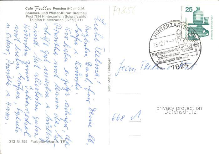 72097372 alte Postkarte Breitnau Pension Faller Cafe postalisch gelaufen Erhaltung siehe scans KatCode: 11110008315016