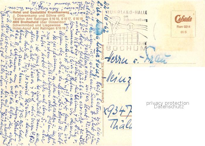73570089 alte Postkarte Breitscheid Duesseldorf Hotel Gaststaette Krummenweg Gartenterrasse postalisch gelaufen Erhaltung siehe scans [FriedD77] KatCode: 11110005111000