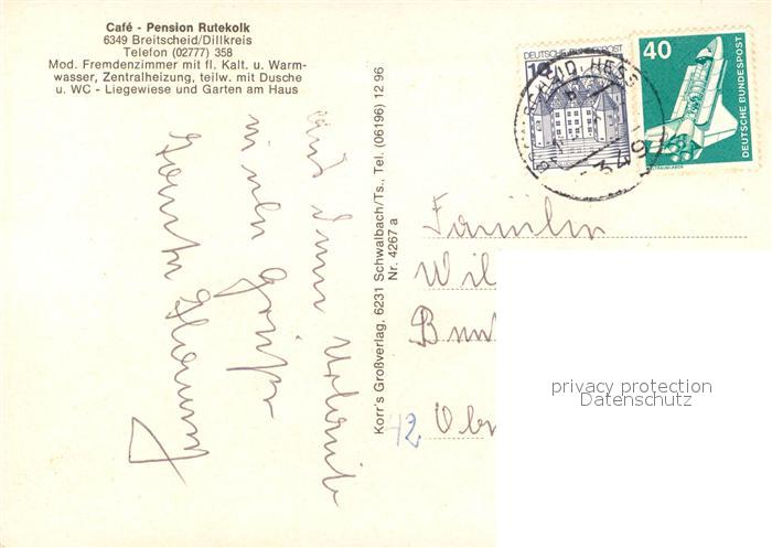 73608934 alte Postkarte Breitscheid Hessen Cafe Pension Rutekolk postalisch gelaufen Erhaltung siehe scans [WerneD78] KatCode: 11110006532004