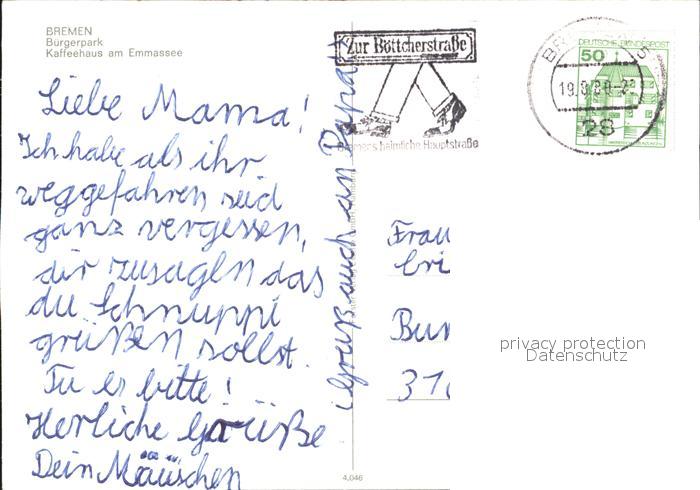 72279939 alte Postkarte BREMEN CITY Buergerpark Kaffeehaus am Emmassee Schwaene postalisch gelaufen Erhaltung siehe scans KatCode: 11110004011000
