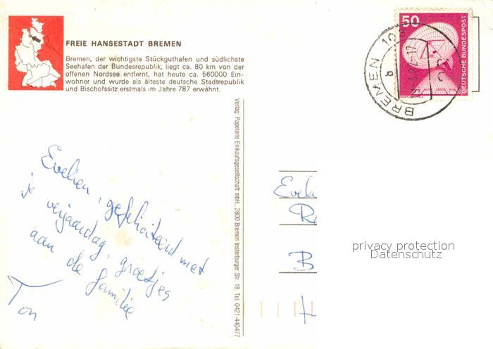 72864957 alte Postkarte BREMEN CITY Fliegeraufnahme Hafen Weser Stadtmusikanten Soegegruppe postalisch gelaufen Erhaltung siehe scans [LiesaD40] KatCode: 11110004011000
