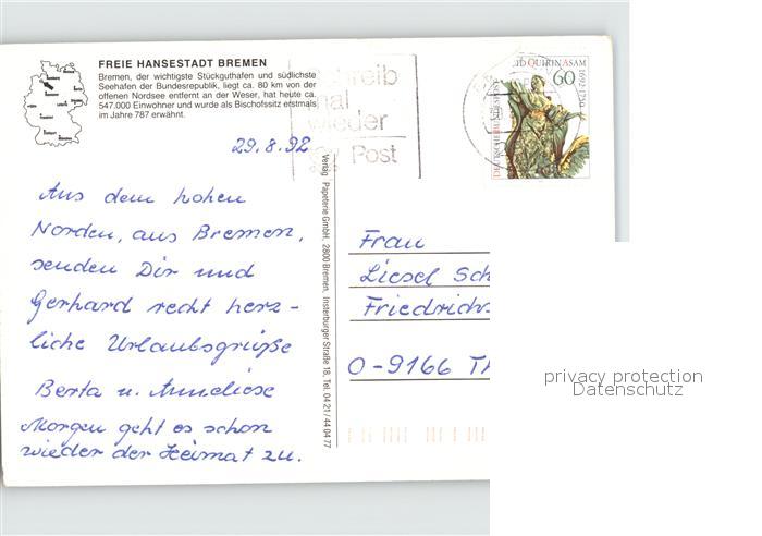 72412642 alte Postkarte BREMEN CITY Hansestadt Marktplatz Kirche Hafen Weser postalisch gelaufen Erhaltung siehe scans KatCode: 11110004011000
