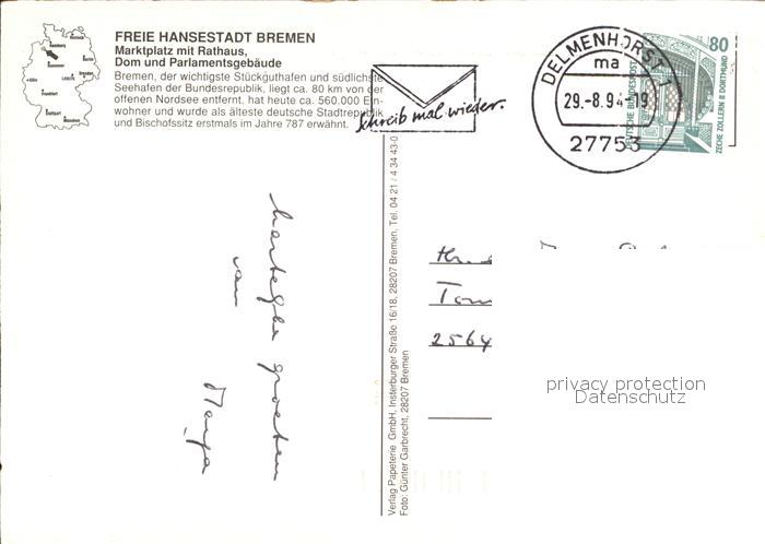 72521941 alte Postkarte BREMEN CITY Marktplatz Rathaus Dom Parlamentsgebaeude postalisch gelaufen Erhaltung siehe scans KatCode: 11110004011000
