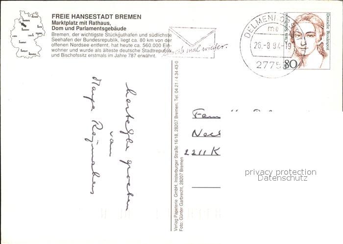 72521939 alte Postkarte BREMEN CITY Marktplatz Rathaus Dom Parlamentsgebaeude postalisch gelaufen Erhaltung siehe scans KatCode: 11110004011000