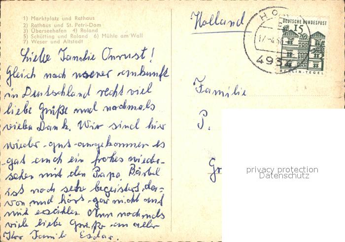 72414388 alte Postkarte BREMEN CITY Marktplatz Rathaus St Petri Dom ueberseehafen Roland Schuetting Muehle am Wall Weser mit Altstadt postalisch gelaufen Erhaltung siehe scans KatCode: 11110004011000