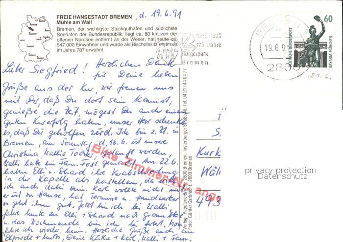 72523777 alte Postkarte BREMEN CITY Muehle am Wall postalisch gelaufen Erhaltung siehe scans KatCode: 11110004011000