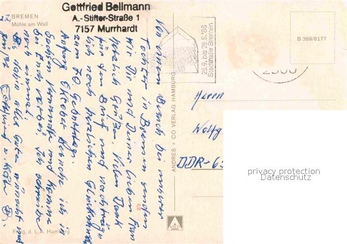 72750408 alte Postkarte BREMEN CITY Muehle am Wall Fliegeraufnahme postalisch gelaufen Erhaltung siehe scans [FriedD77] KatCode: 11110004011000