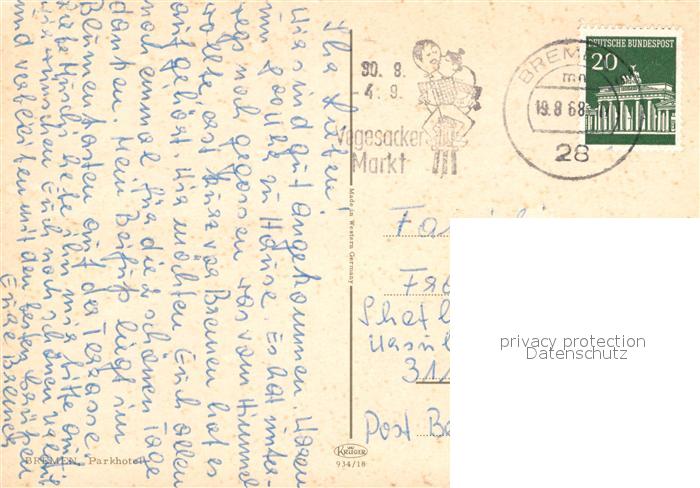 73016442 alte Postkarte BREMEN CITY Parkhotel postalisch gelaufen Erhaltung siehe scans [NatalD47] KatCode: 11110004011000