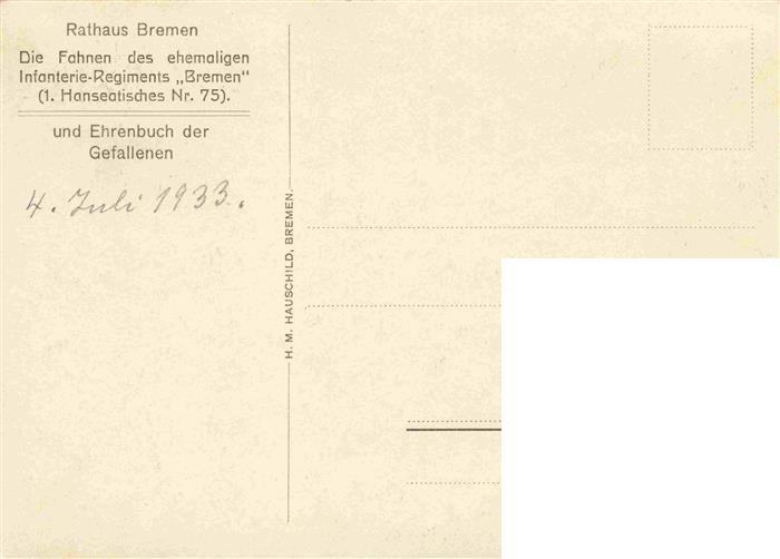 73972800 BREMEN CITY Rathaus Fahnen des ehemaligen Infanterie-Regiments Bremen 1. Hanseatisches Nr. 75 Ehrenbuch der Gefallenen postalisch nicht gelaufen Erhaltung siehe scans [FriedD77] KatCode: 11110004011000