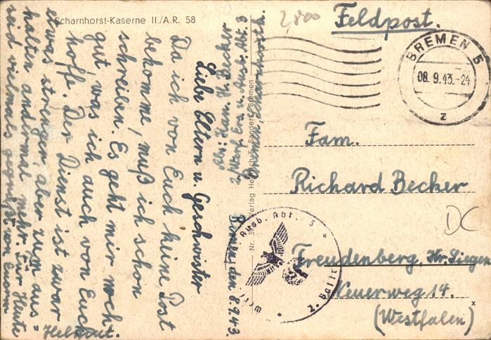 41296933 BREMEN CITY Scharnhorst-Kaserne NZ4 postalisch gelaufen gute Erhaltung Alte Ansichtskarte Postkarte alte Postkarte hz_C Katcode 11110004011000