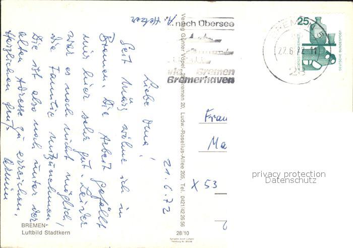 72479874 alte Postkarte BREMEN CITY Stadtkern Weser Fliegeraufnahme postalisch gelaufen Erhaltung siehe scans KatCode: 11110004011000