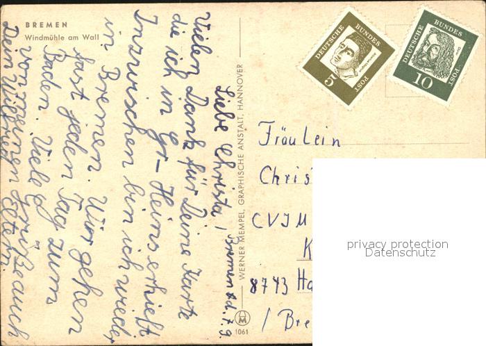 72607789 alte Postkarte BREMEN CITY Windmuehle am Wall postalisch gelaufen Erhaltung siehe scans [LiesaD40] KatCode: 11110004011000