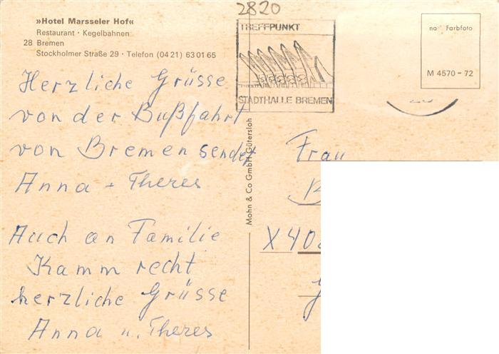 73872146 BREMEN DE Hotel Marsseler Hof Restaurant Kegelbahn postalisch gelaufen Erhaltung siehe scans [FriedD77] alte Postkarte Frie Katcode 11110004011000