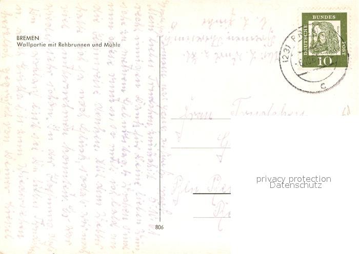 73151508 alte Postkarte BREMEN DE Wallpartie mit Rehbrunnen und Muehle postalisch gelaufen Erhaltung siehe scans [FriedD77] KatCode: 11110004011000
