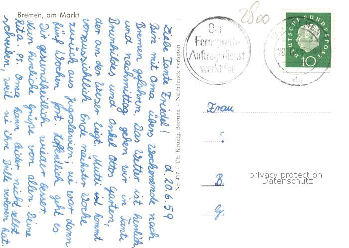 73564795 alte Postkarte Bremen Marktplatz postalisch gelaufen Erhaltung siehe scans [LiesaD40] KatCode: 11110004011000