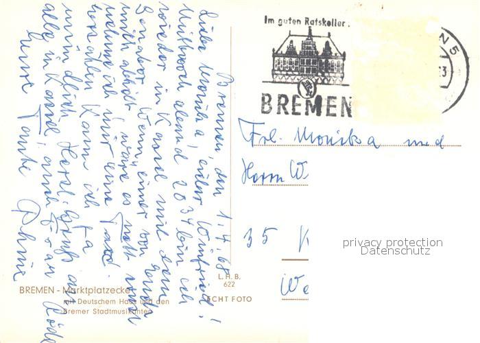 73239131 alte Postkarte Bremen Marktplatzecke Stadtmusikanten postalisch gelaufen Erhaltung siehe scans [NatalD47] KatCode: 11110004011000