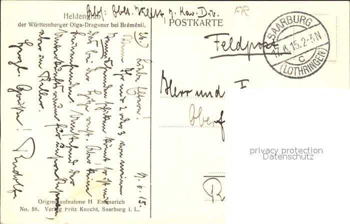 11916543 carte postale Bremenil Teilansicht Heldengrab der Wuerttemberer Olga Dragoner postalisch gelaufen Feldpost Erhaltung siehe scans KatCode: 11170054254097