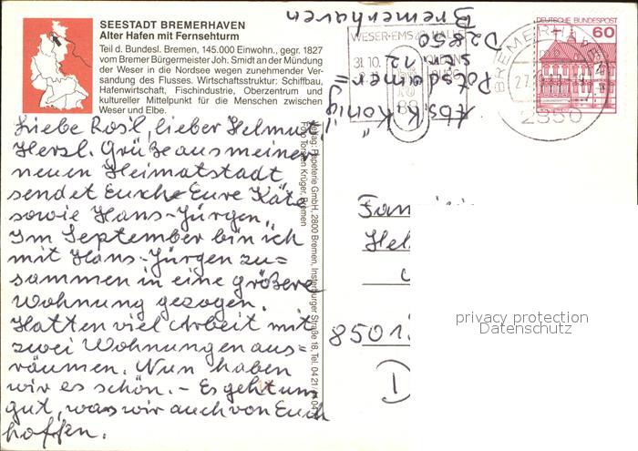 72525329 alte Postkarte Bremerhaven Alter Hafen mit Fernsehturm postalisch gelaufen Erhaltung siehe scans KatCode: 11110004012000