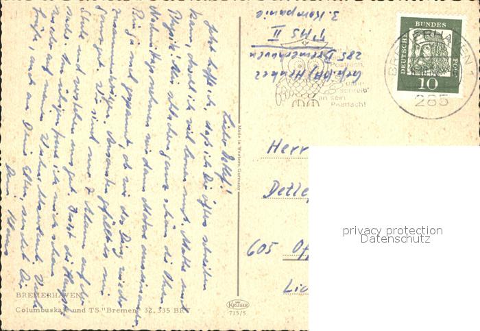 72288216 alte Postkarte Bremerhaven Columbuskaje TS Bremen postalisch gelaufen Erhaltung siehe scans KatCode: 11110004012000