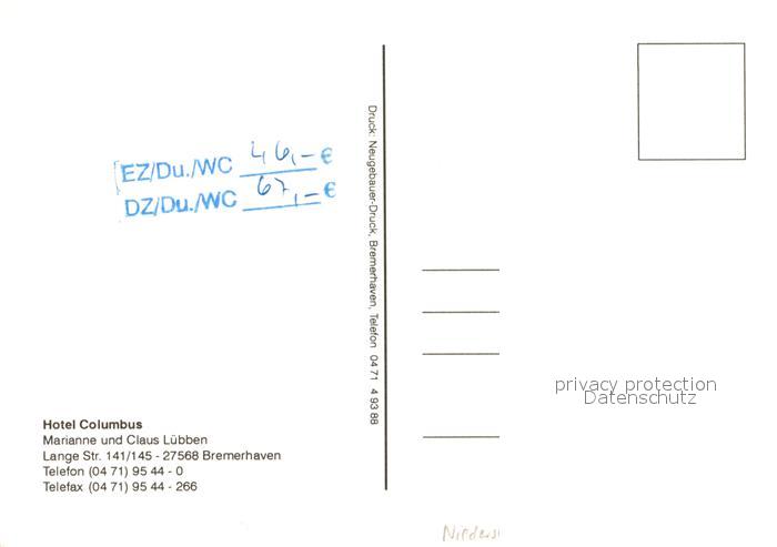 73662664 Bremerhaven Hotel Restaurant Columbus Garten postalisch nicht gelaufen Erhaltung siehe scans [FriedD77] KatCode: 11110004012000