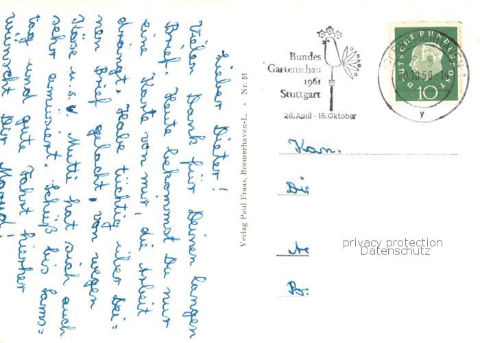 73767834 alte Postkarte Bremerhaven Nordseehotel Stadttheater Lloydstrasse Buergermeister Smidt Denkmal Stadtbad Hafenmole Blick auf die Weser postalisch gelaufen Erhaltung siehe scans [FriedD77] KatCode: 11110004012000