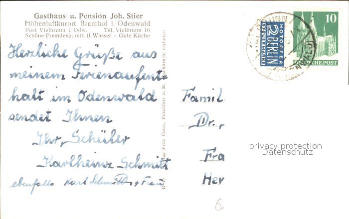 31731442 alte Postkarte Bremhof Odenwald Gasthaus Pension Joh. Stier postalisch gelaufen Erhaltung siehe scans KatCode: 11110006437011