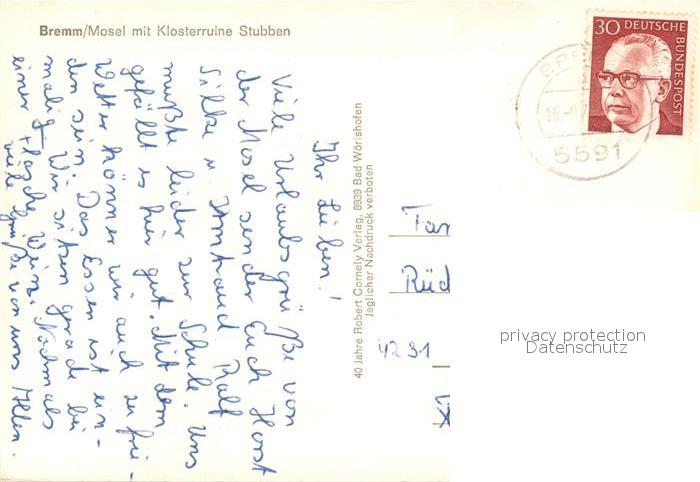 73176021 alte Postkarte Bremm Mosel Panorama Moseltal mit Klosterruine Stubben postalisch gelaufen Erhaltung siehe scans [FriedD77] KatCode: 11110007135012