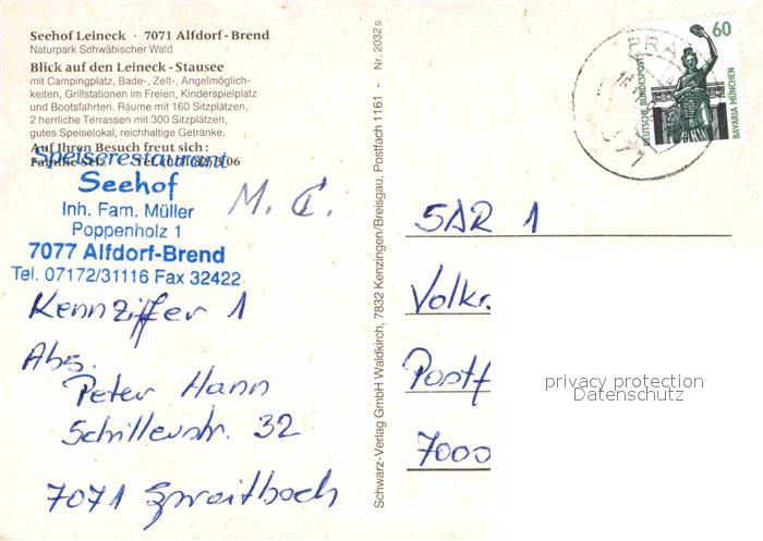 72751112 alte Postkarte Brend Alfdorf Seehof Leineck Restaurant Terrasse Stausee Naturpark Schwaebischer Wald postalisch gelaufen Erhaltung siehe scans [FriedD77] KatCode: 11110008119001