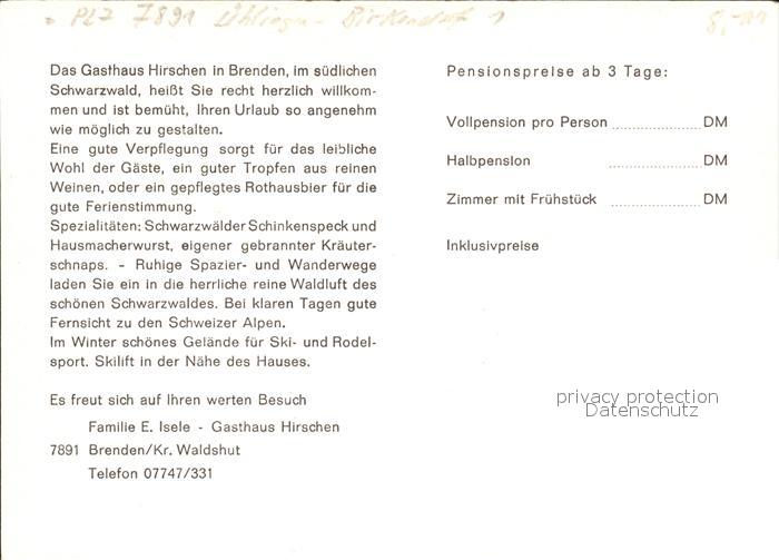 72354562 Brenden uehlingen-Birkendorf Gasthaus Pension Zum Hirschen postalisch nicht gelaufen Werbekarte (keine Postkarte) Erhaltung siehe scans KatCode: 11110008337128