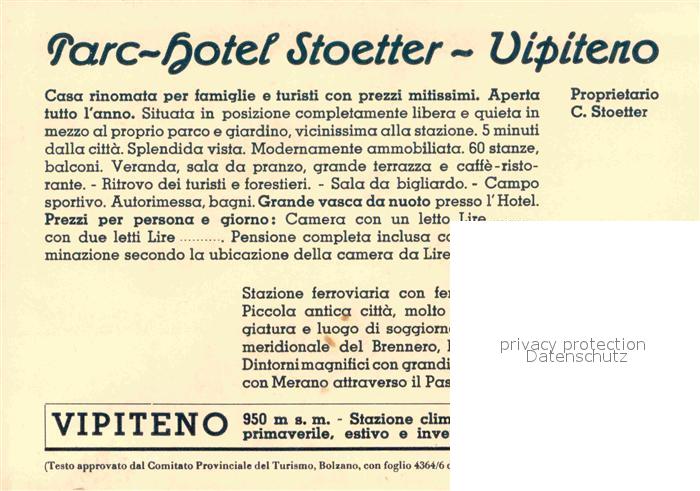 32664904 Brennero Parc-Hotel Stoetter postalisch nicht gelaufen Werbekarte (keine Postkarte) Erhaltung siehe scans [LiesaD40] KatCode: 11240