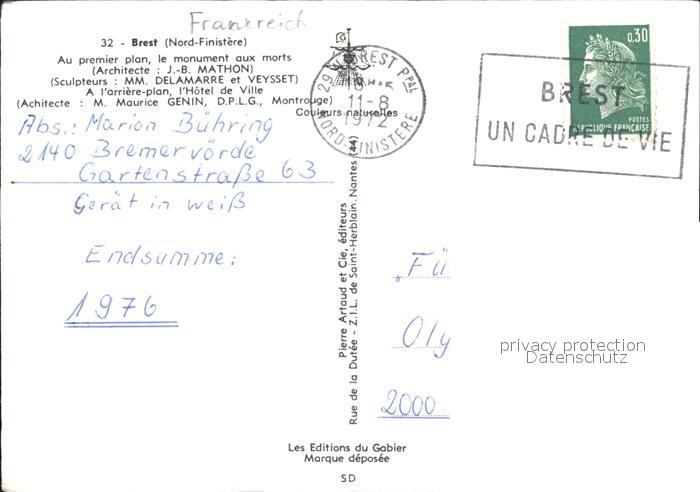 12435075 carte postale Brest 29 Le monument aux morts postalisch gelaufen Erhaltung siehe scans KatCode: 11170029129019