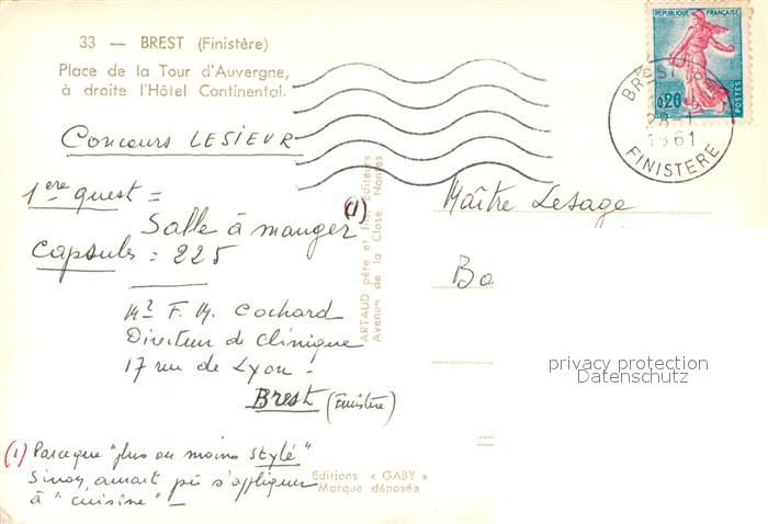 13597850 Brest 29 Place de la Tour d’Auvergne a droite l’Hotel Continental postalisch gelaufen Erhaltung siehe scans [WerneD78] carte postale Wern Katcode 11170029129019