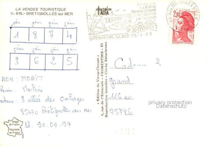 13213517 carte postale Bretignolles-sur-Mer Baignades peche promenades en foret postalisch gelaufen Erhaltung siehe scans [WerneD78] KatCode: 11170085385035