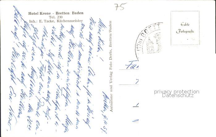 31722588 alte Postkarte Bretten Baden Hotel Krone postalisch gelaufen Erhaltung siehe scans KatCode: 11110008215007