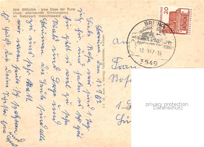 73101020 alte Postkarte Breuna Ortsansicht postalisch gelaufen Erhaltung siehe scans [WerneD78] KatCode: 11110006633004