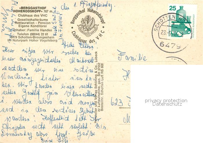 73054765 alte Postkarte Breungeshain Berggasthof Hoherodskopf Fliegeraufnahme postalisch gelaufen Erhaltung siehe scans [WerneD78] KatCode: 11110006535016