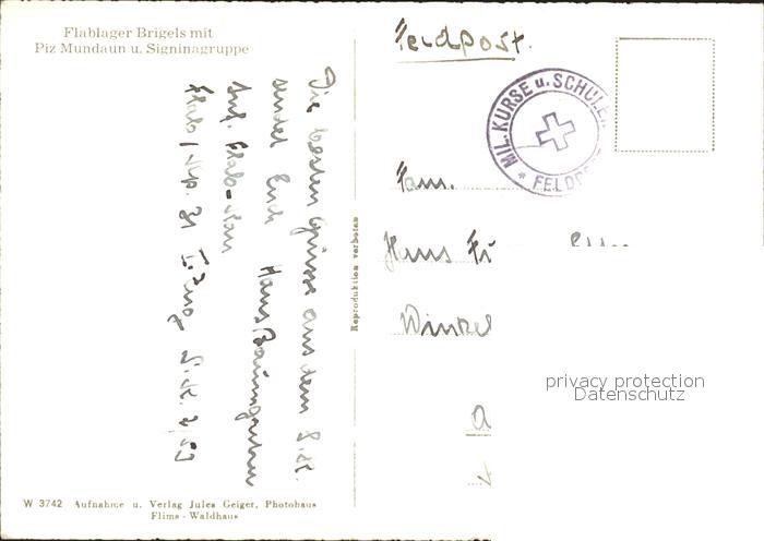 11632554 alte Postkarte Brigels Flablager mit Piz Mundaun und Signinagruppe postalisch gelaufen Feldpost Erhaltung siehe scans KatCode: 11470100355418