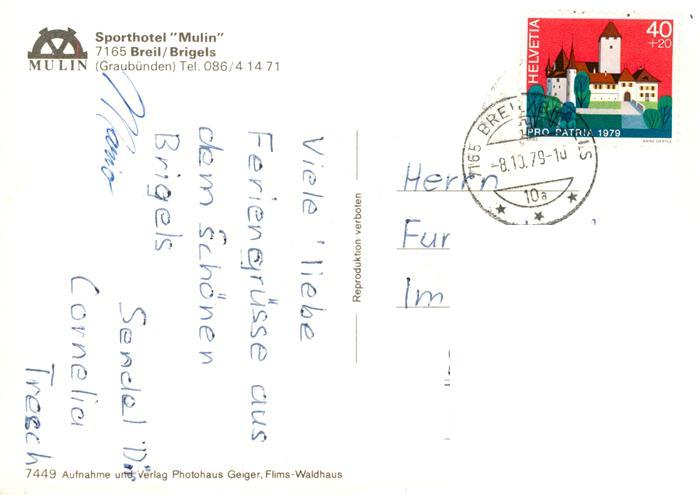 13887433 alte Postkarte Brigels GR Sporthotel Mulin postalisch gelaufen Erhaltung siehe scans [WerneD78] KatCode: 11470100355418