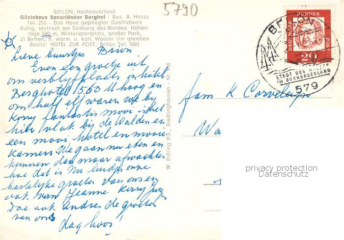73852178 Brilon Hochsauerlandkreis NRW Gaestehaus Sauerlaender Berghof postalisch gelaufen Erhaltung siehe scans [FriedD77] alte Postkarte Frie Katcode 11110005958012