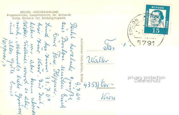 73779509 Brilon Hochsauerlandkreis NRW Propsteikirche Panorama Landstrasse Brunnen Derkere Tor Borberg-Kapelle postalisch gelaufen Erhaltung siehe scans [FriedD77] alte Postkarte Frie Katcode 11110005958012