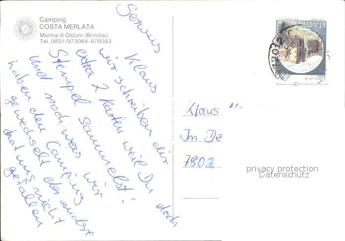 old postcard Brindisi Camping Costa Merlata postalisch gelaufen Erhaltung siehe scans