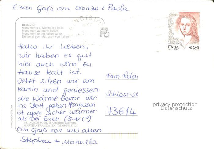 old postcard Brindisi Monumento al Marinaio d`italia Denkmal zum Matrosen von Italien postalisch gelaufen Erhaltung siehe scans